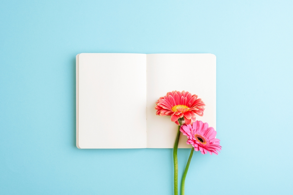 Open,Blank,Notebook,With,Pink,And,Orange,Gerbera,Flowers,On